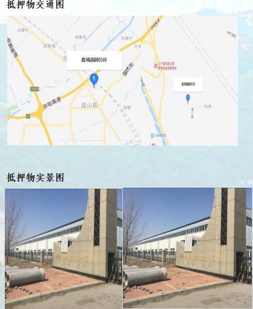 抵押物位于盤錦市雙臺子區盤山縣,交通便利。抵押房產位于抵押土地之上,抵押房產的狀態較好,從外部觀察為九成新,用途為辦公樓、倉儲等。抵押土地為國有出讓工業用地,狀態較好,中間部份大面積空置,地型寬闊規整,升值空間較大。